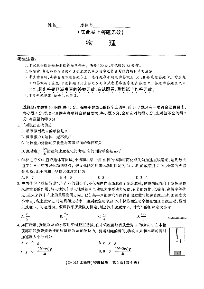 2025届江西省九校联考高三上学期11月期中考试 物理