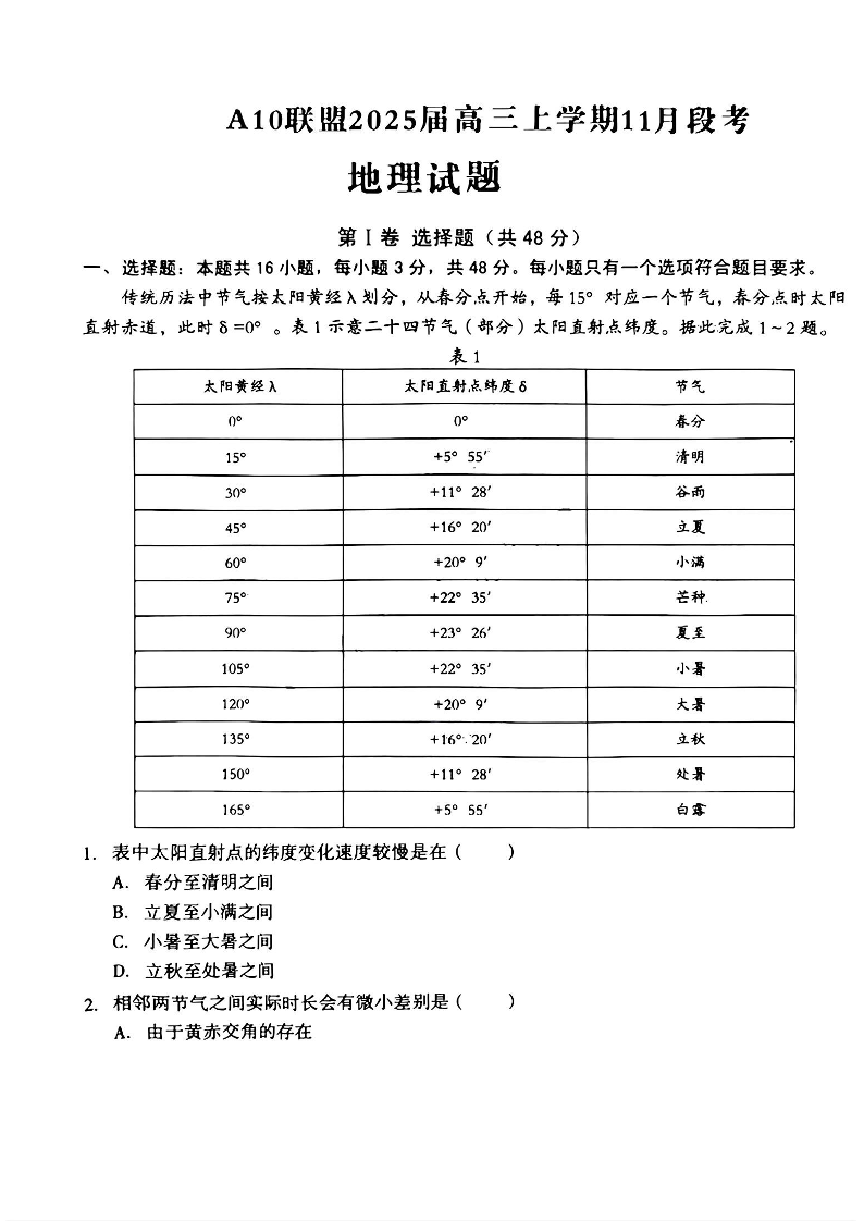 A10联盟2025届高三上学期11月份段考 地理