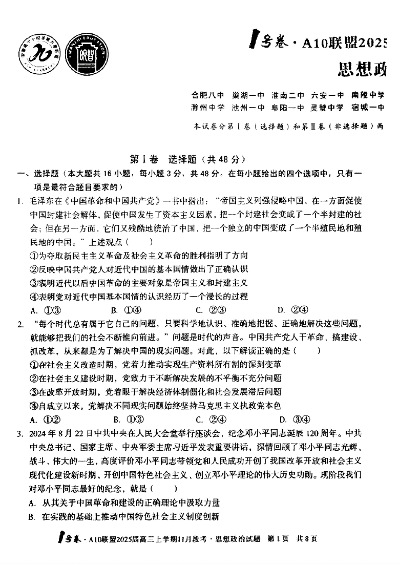 A10联盟2025届高三上学期11月份段考 政治