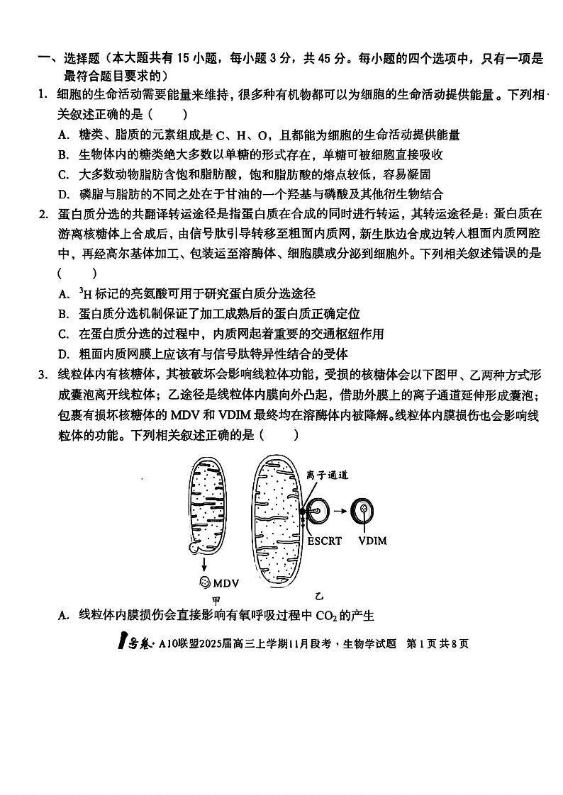 A10联盟2025届高三上学期11月份段考 生物
