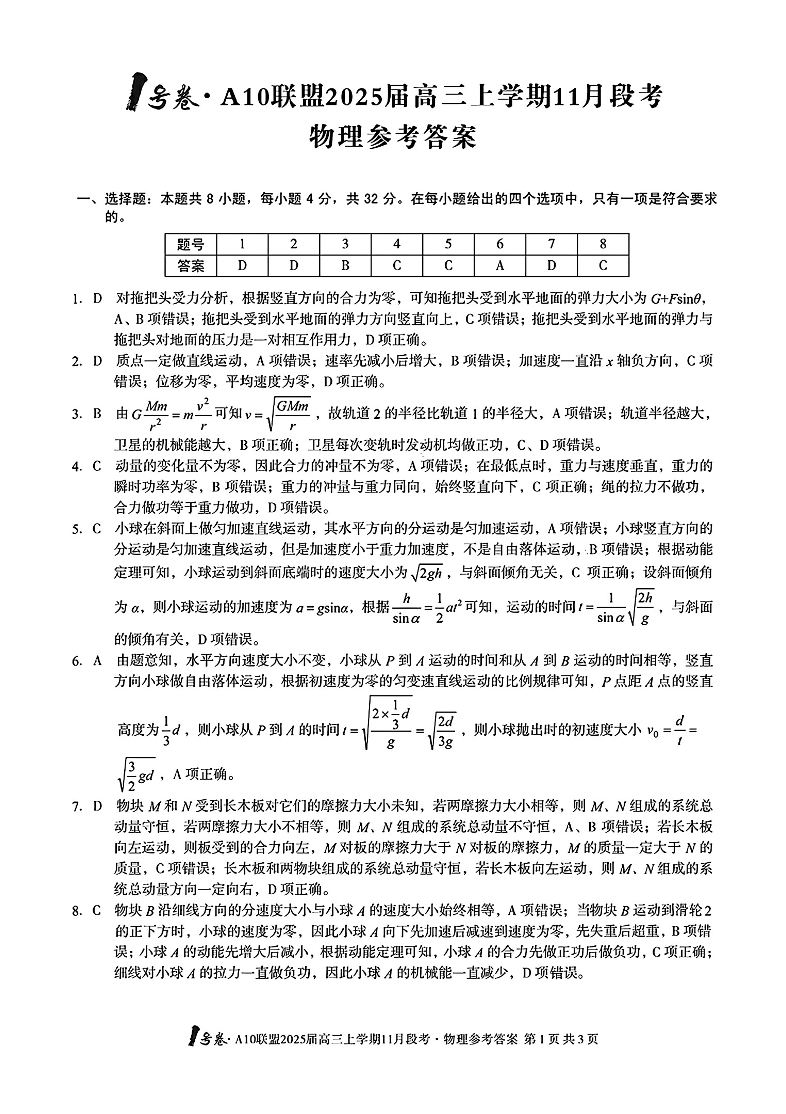 A10联盟2025届高三上学期11月份段考 物理答案