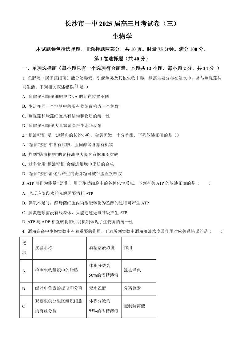 湖南省长沙市长沙一中2025届高三月考试卷(三)生物