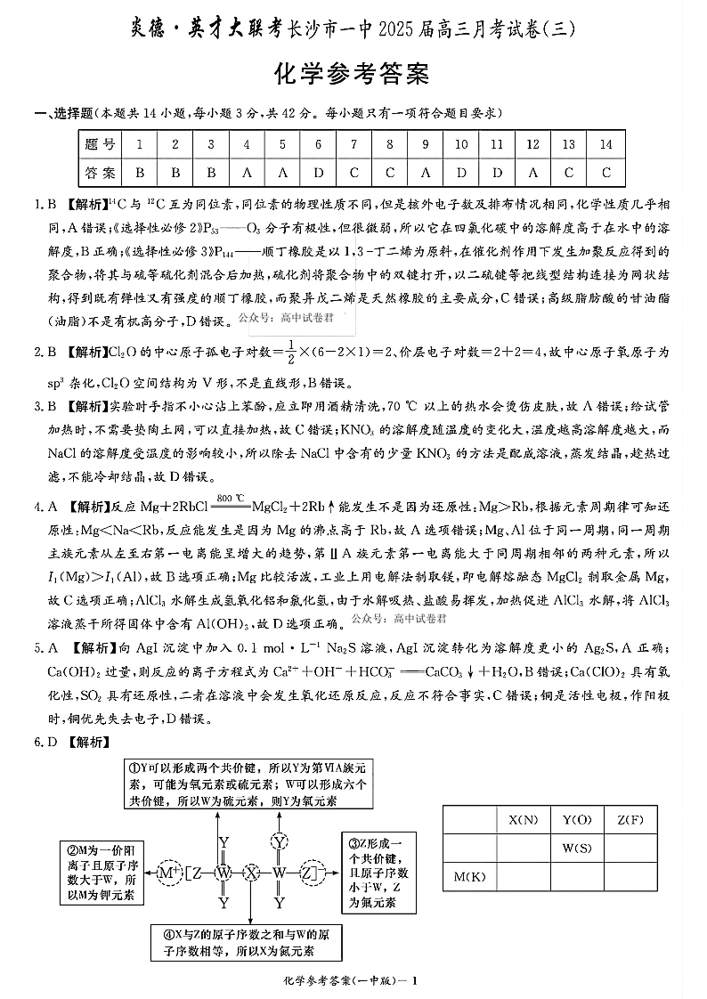 湖南省长沙市长沙一中2025届高三月考试卷(三)化学答案