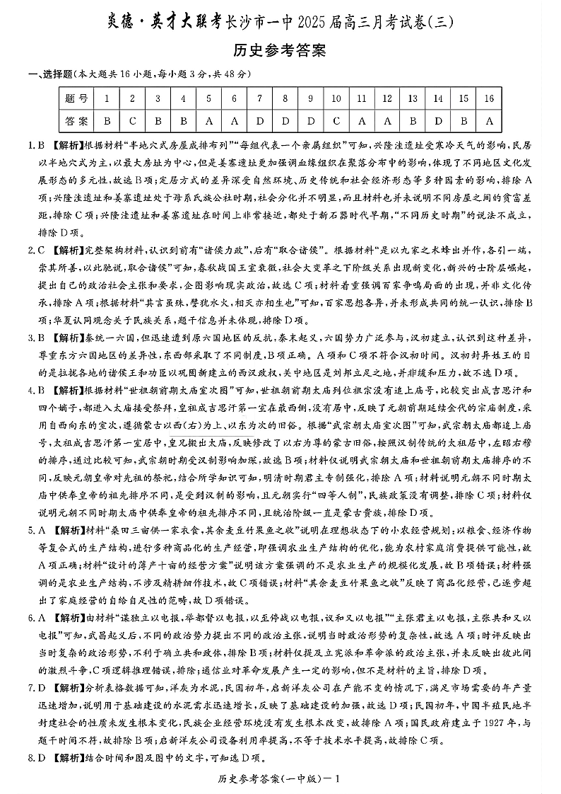 湖南省长沙市长沙一中2025届高三月考试卷(三)历史答案