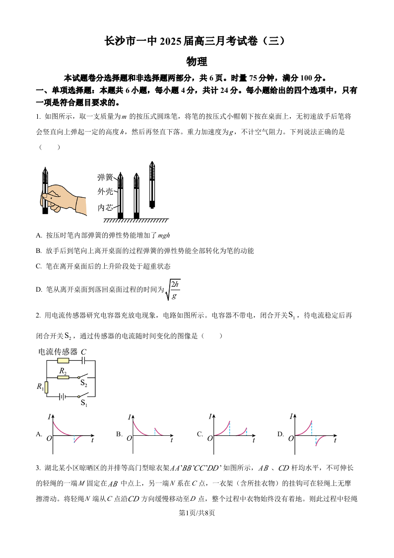 湖南省长沙市长沙一中2025届高三月考试卷(三)物理