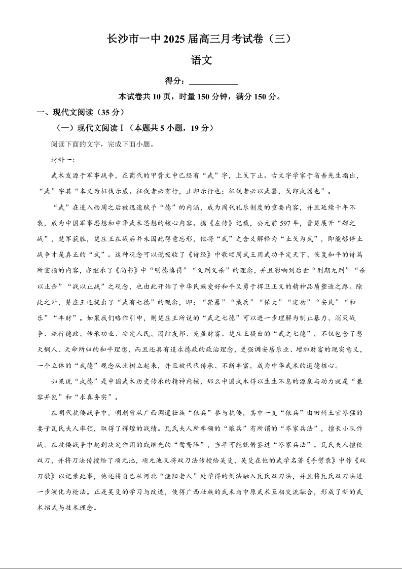 湖南省长沙市长沙一中2025届高三月考试卷(三)语文