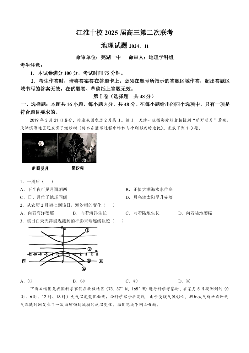 安徽省江淮十校2025届高三上学期第二次联考 地理