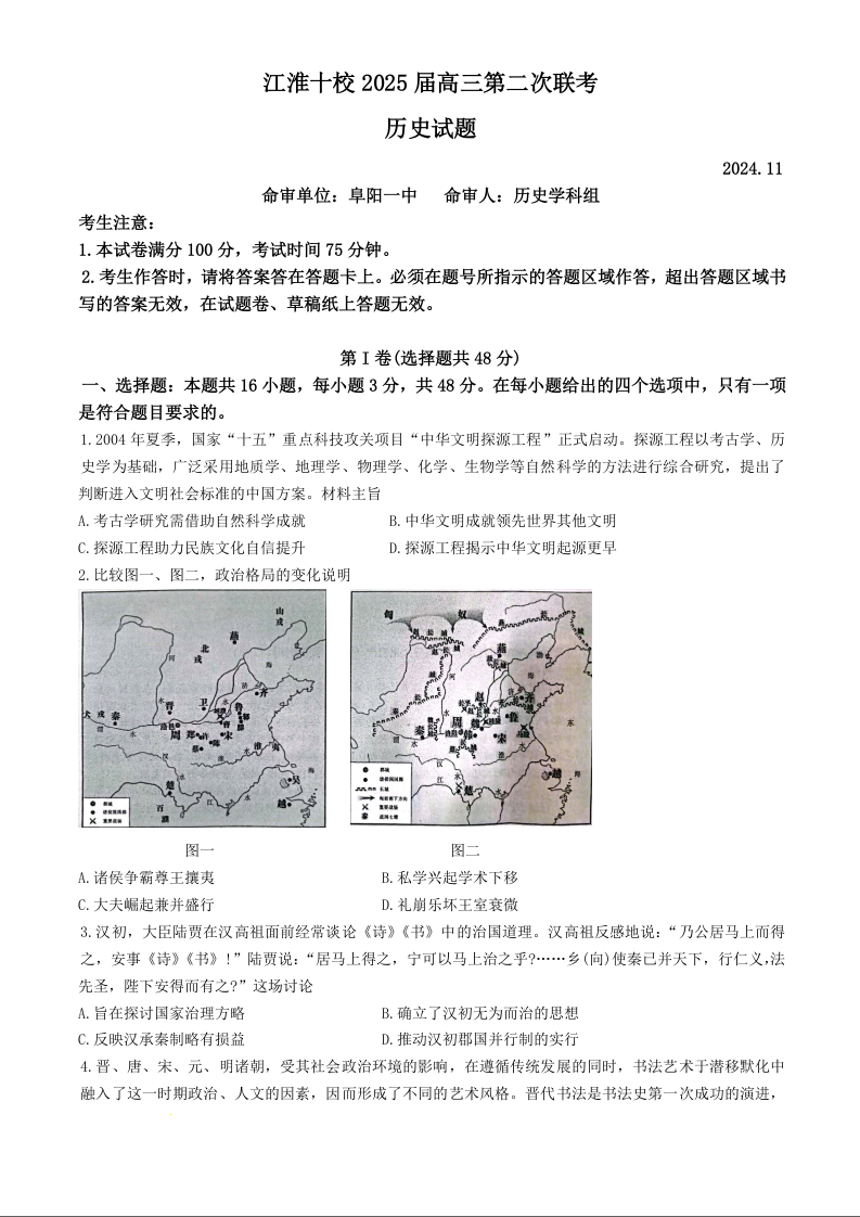 安徽省江淮十校2025届高三上学期第二次联考 历史