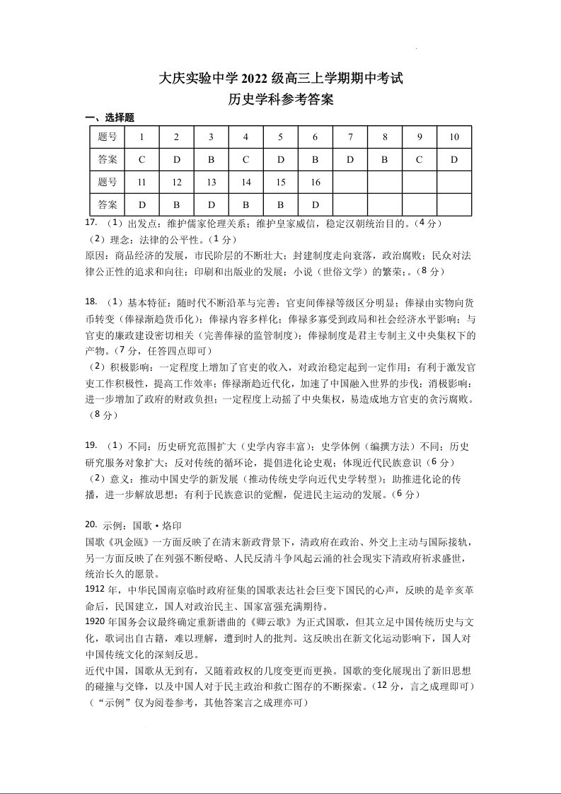 黑龙江省大庆市实验中学实验二部2024-2025学年高三上学期期中考试 历史答案
