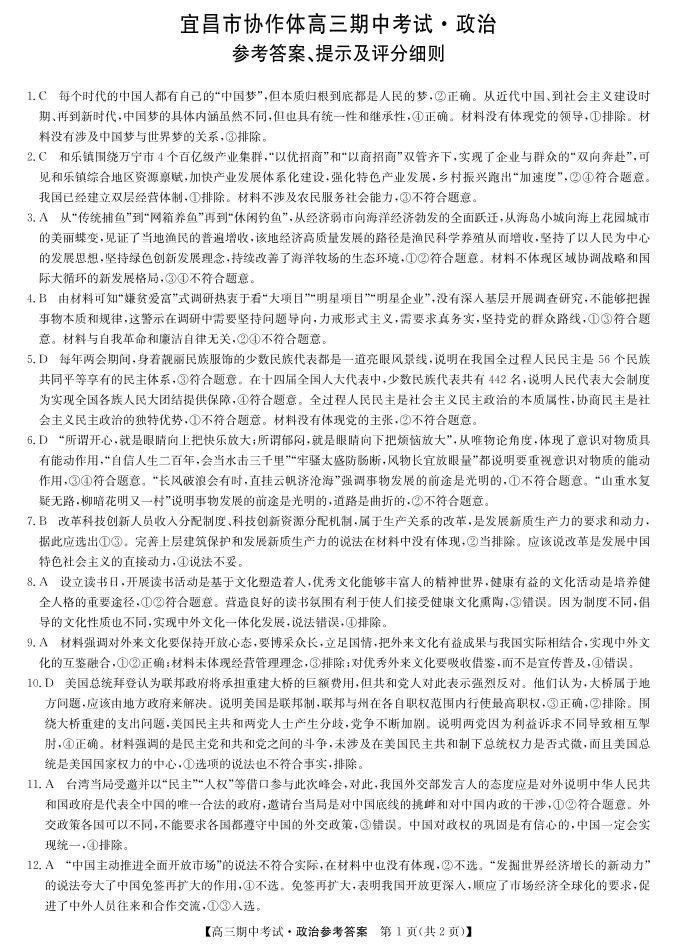 湖北省宜昌协作体2025届高三11月联考 政治答案