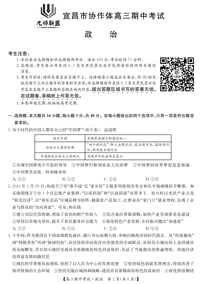 湖北省宜昌协作体2025届高三11月联考 政治