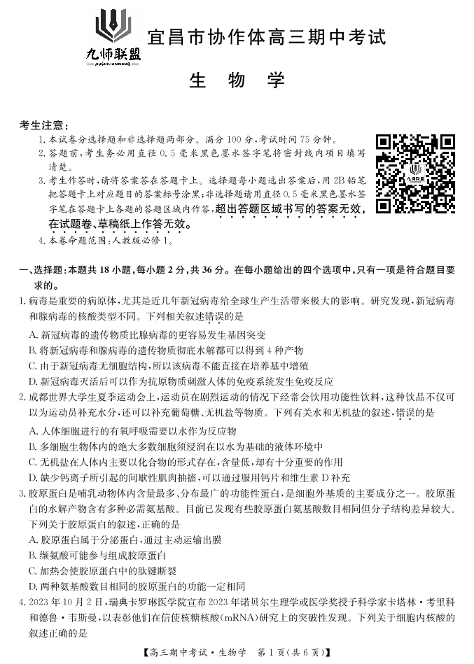 湖北省宜昌协作体2025届高三11月联考 生物