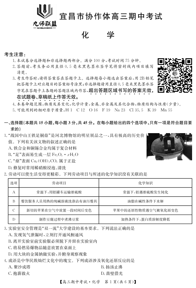 湖北省宜昌协作体2025届高三11月联考 化学