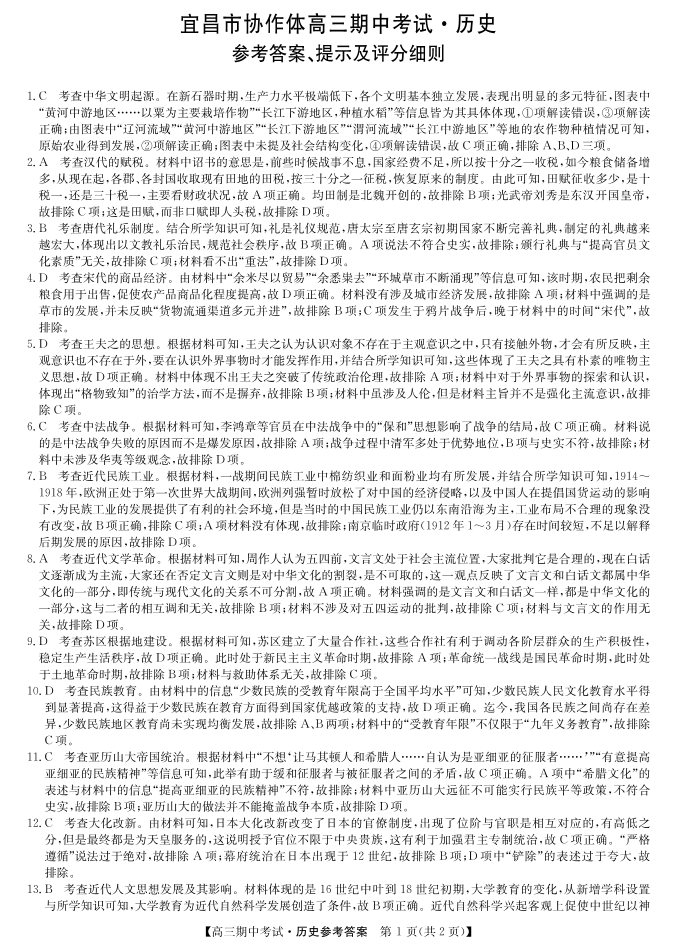 湖北省宜昌协作体2025届高三11月联考 历史答案