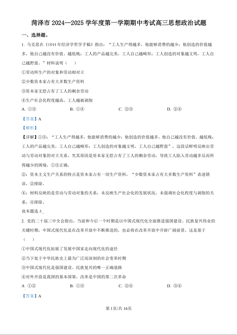 山东省菏泽市2025届高三上学期11月期中考试 政治答案