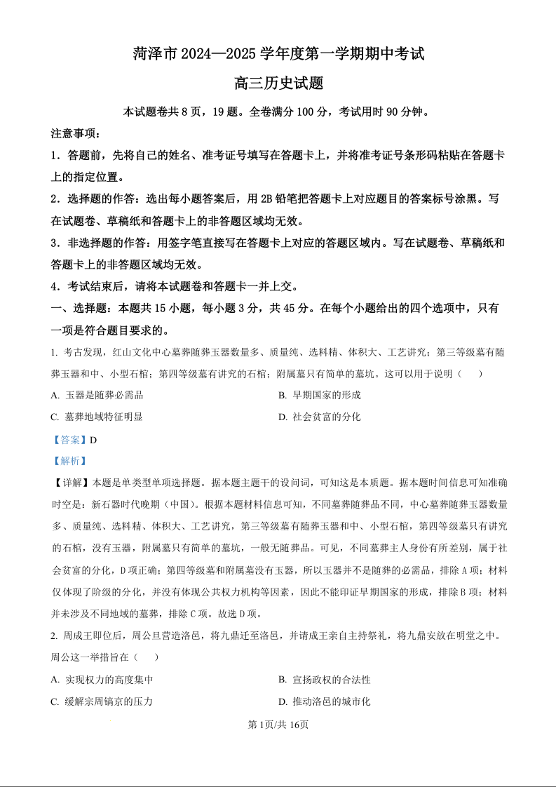 山东省菏泽市2025届高三上学期11月期中考试 历史答案