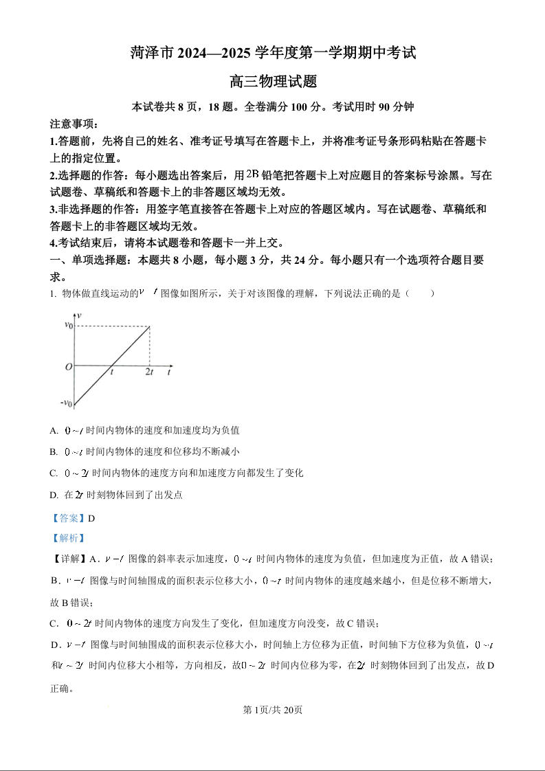 山东省菏泽市2025届高三上学期11月期中考试 物理答案