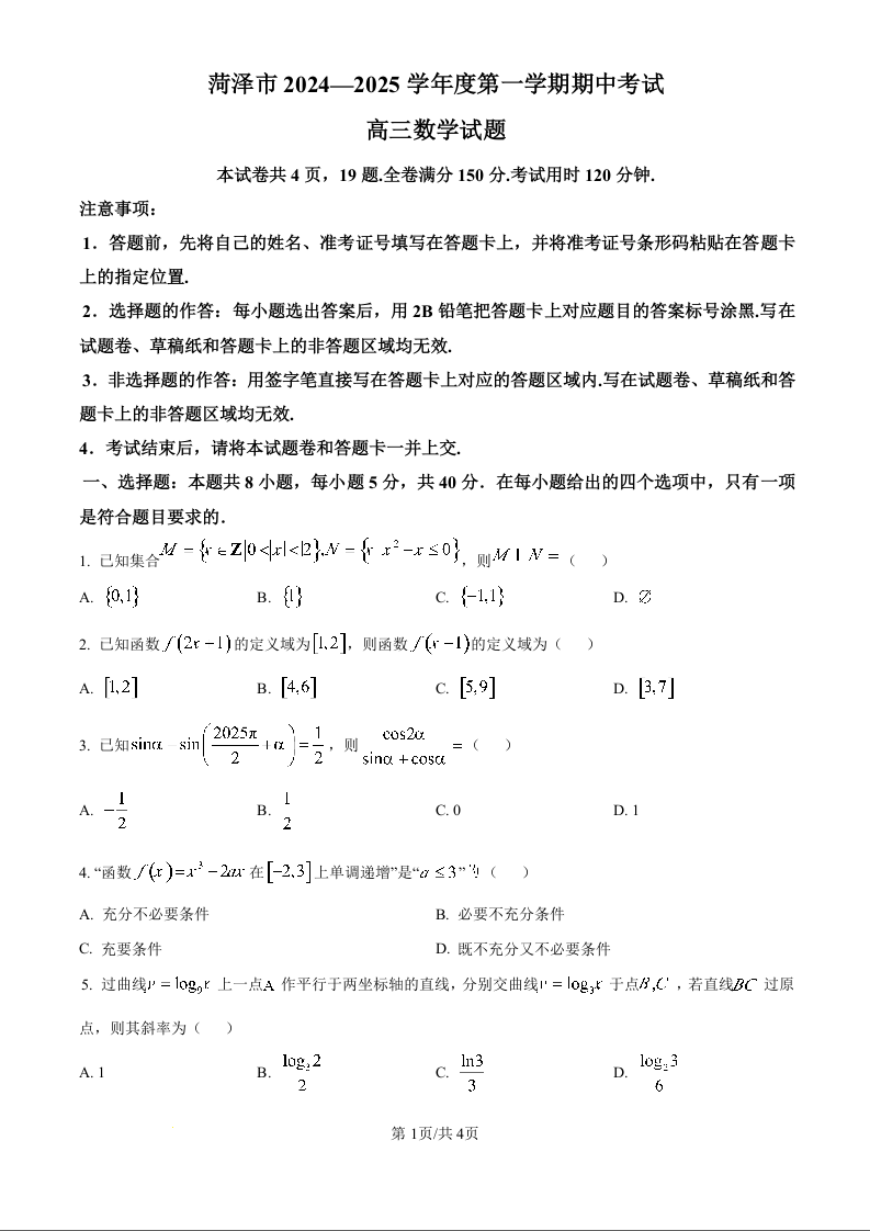 山东省菏泽市2025届高三上学期11月期中考试 数学
