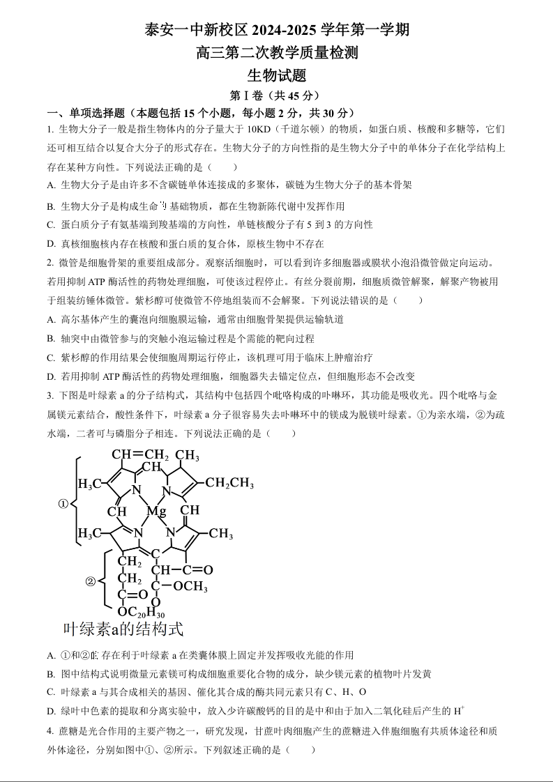 山东省泰安第一中学2025届高三上学期11月月考 生物