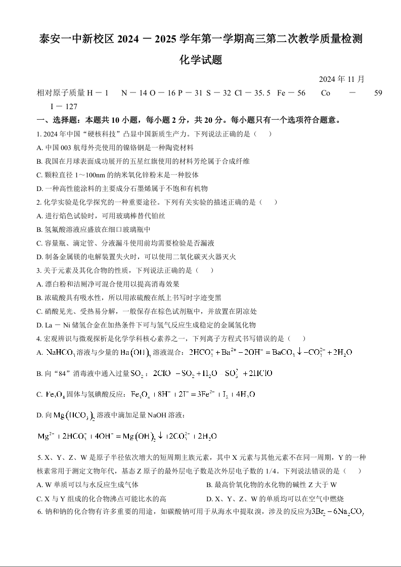 山东省泰安第一中学2025届高三上学期11月月考 化学