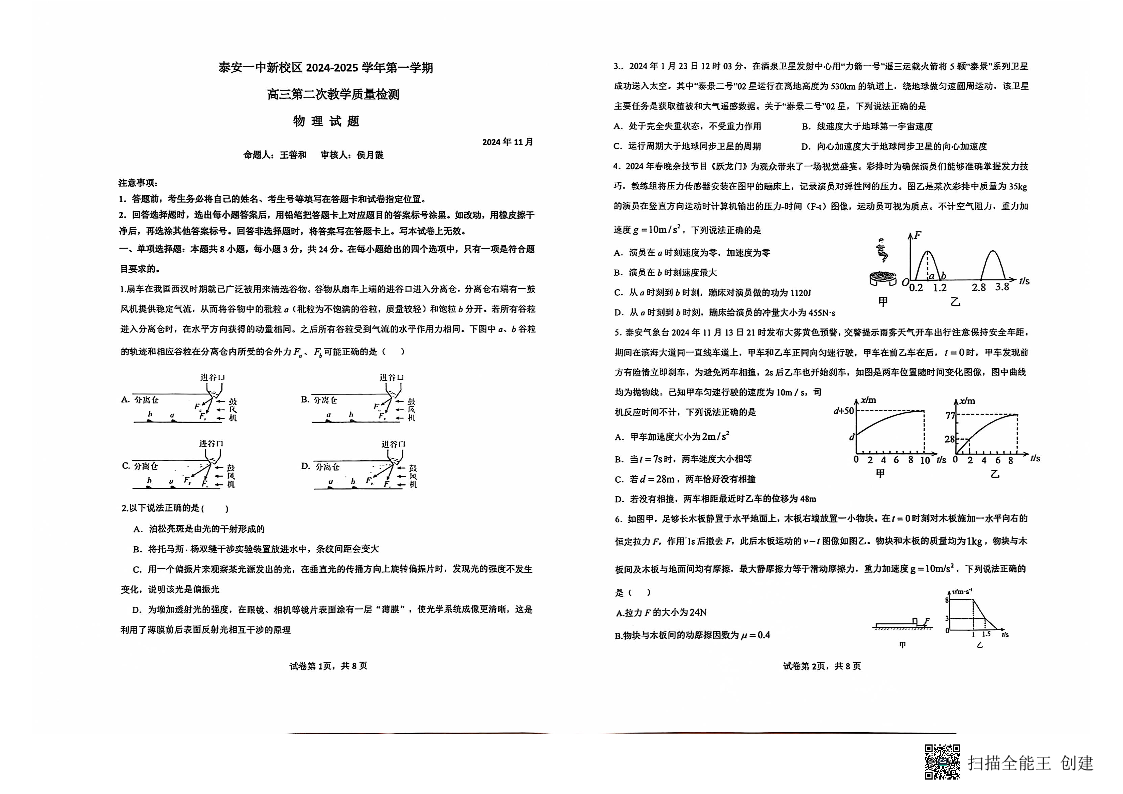 山东省泰安第一中学2025届高三上学期11月月考 物理