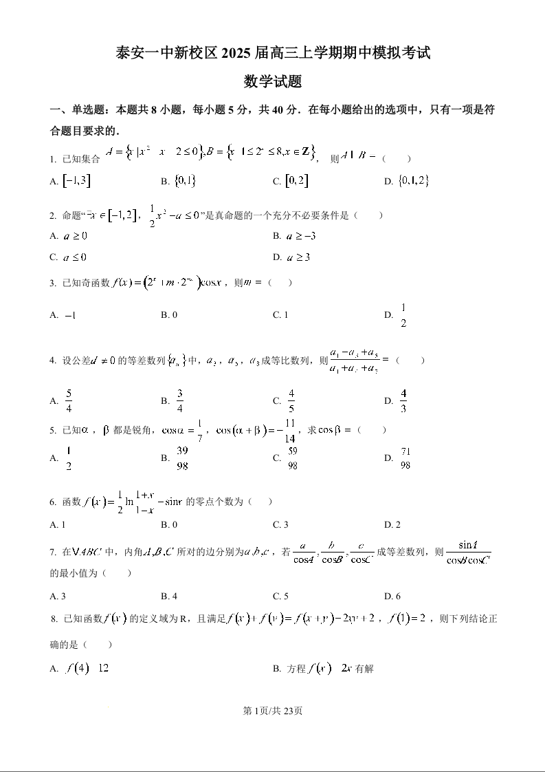山东省泰安第一中学2025届高三上学期11月月考 数学