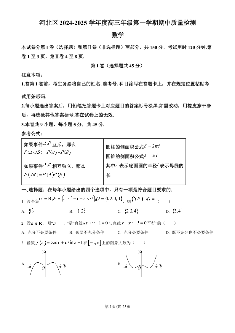 天津市河北区2025届高三上学期期中质量检测 数学