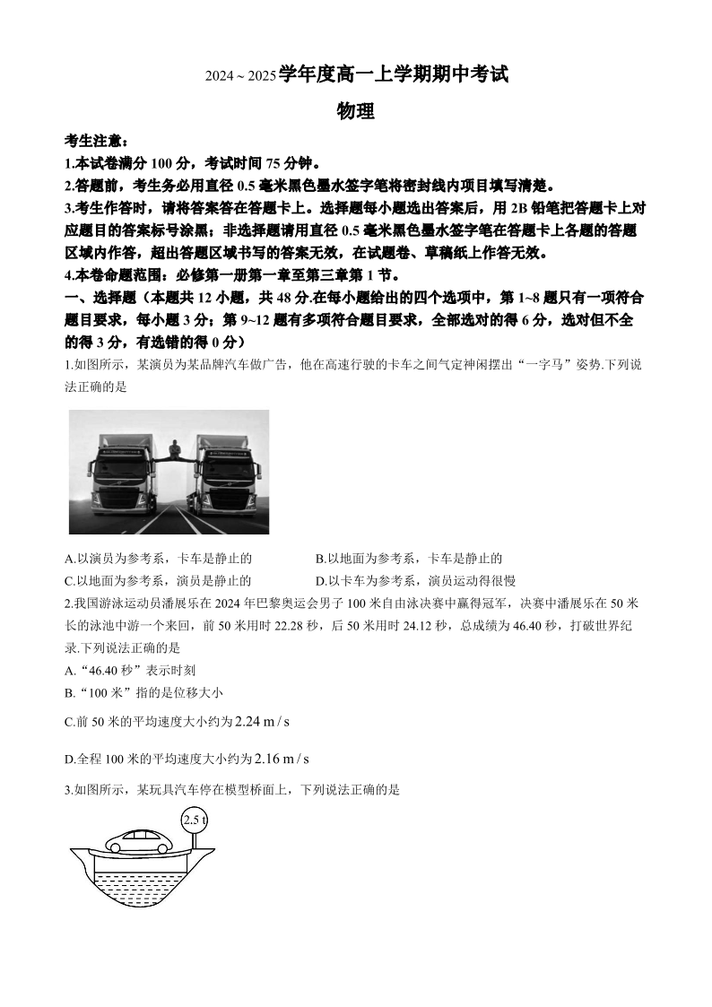 广东省深圳市盟校联盟2024-2025学年高一上学期11月期中考试 物理