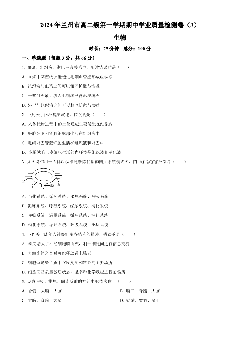 2024 年兰州一中高二级第一学期期中学业质量检测卷 生物