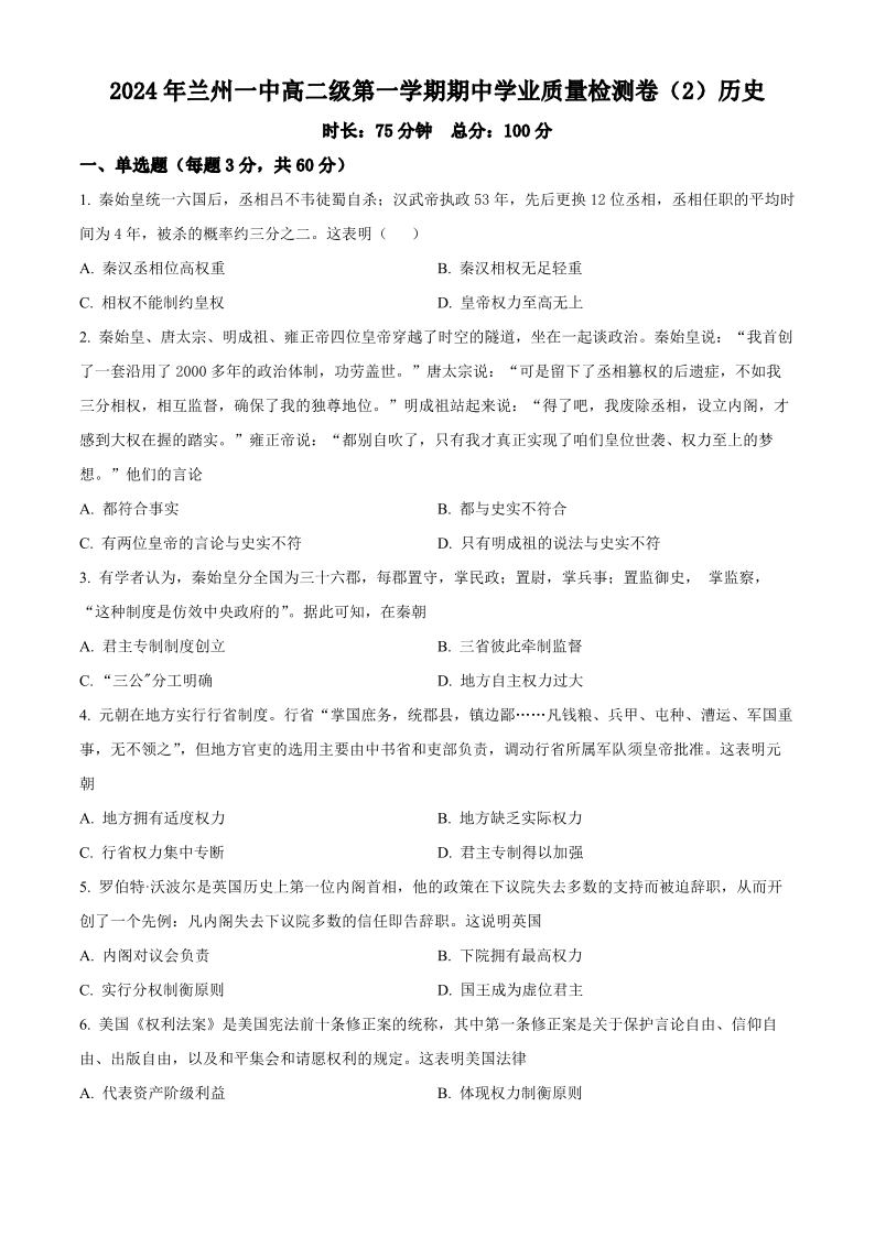 2024 年兰州一中高二级第一学期期中学业质量检测卷 历史