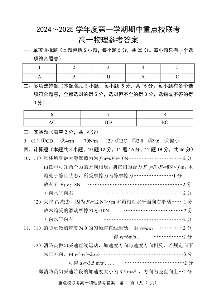 天津市五区县重点校联考2024-2025学年高一上学期11月期中考试 物理答案