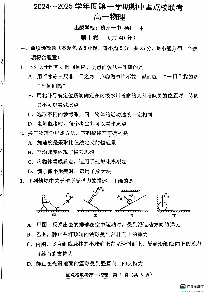 天津市五区县重点校联考2024-2025学年高一上学期11月期中考试 物理