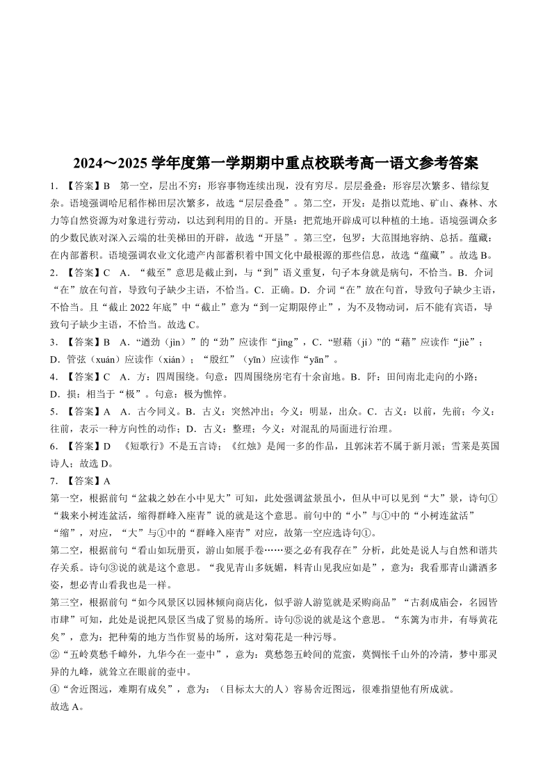 天津市五区县重点校联考2024-2025学年高一上学期11月期中考试 语文答案