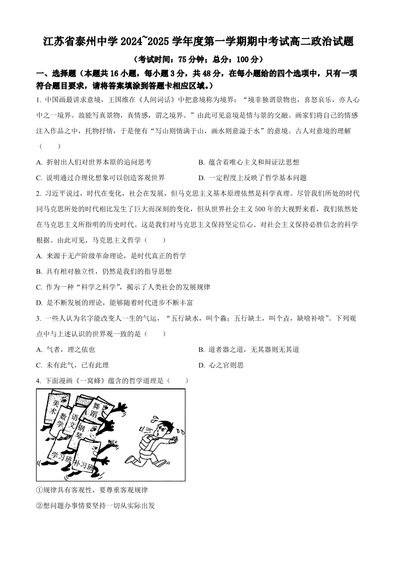 江苏省泰州中学2024-2025学年高二上学期11月期中考试 政治