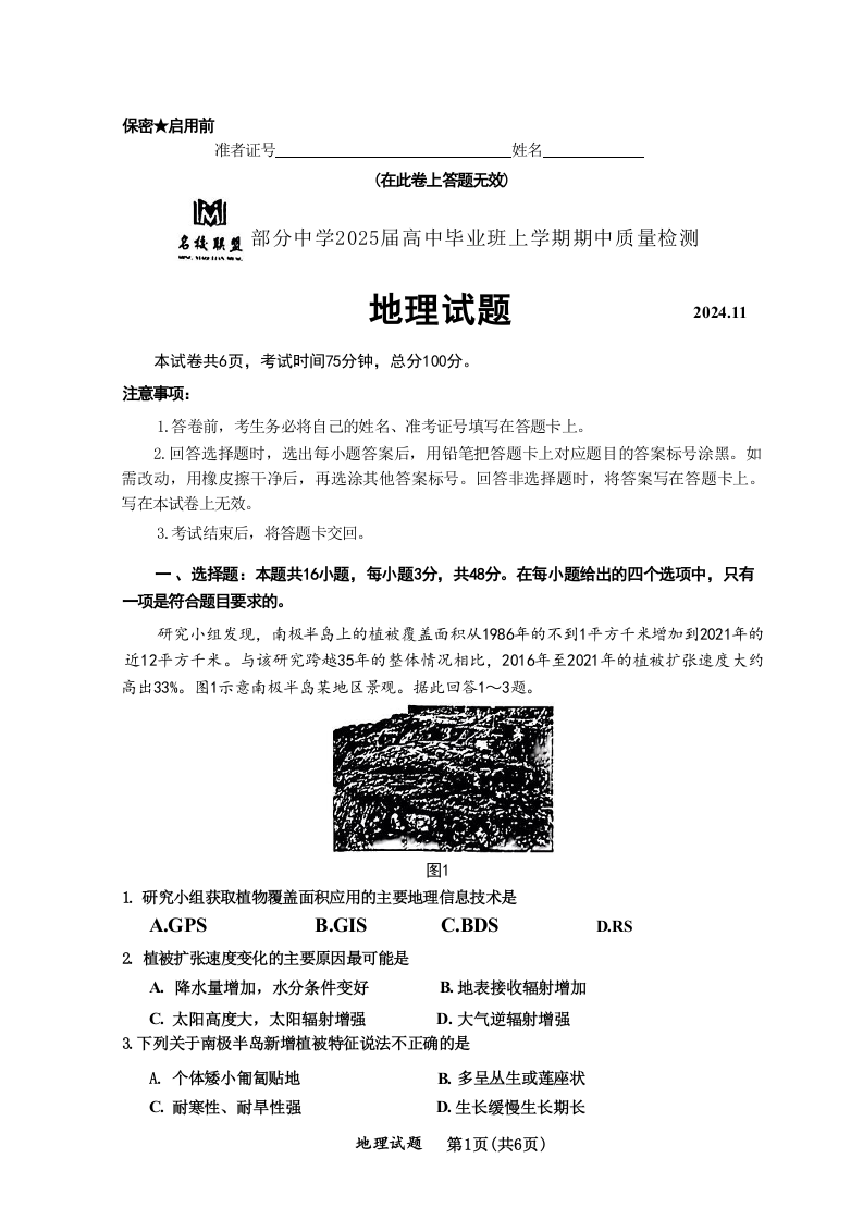 福建省名校联盟2025届高中毕业班上学期期中质量检测 地理