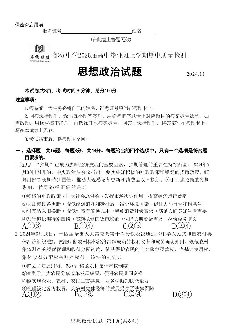 福建省名校联盟2025届高中毕业班上学期期中质量检测 政治