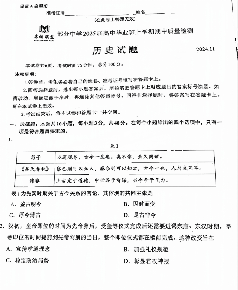 福建省名校联盟2025届高中毕业班上学期期中质量检测 历史