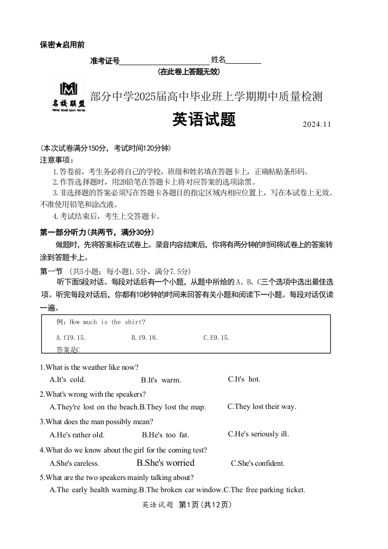 福建省名校联盟2025届高中毕业班上学期期中质量检测 英语