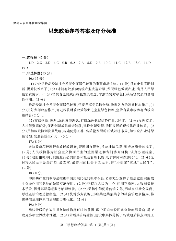 临沂市2025届高三上学期教学质量检测考 政治答案