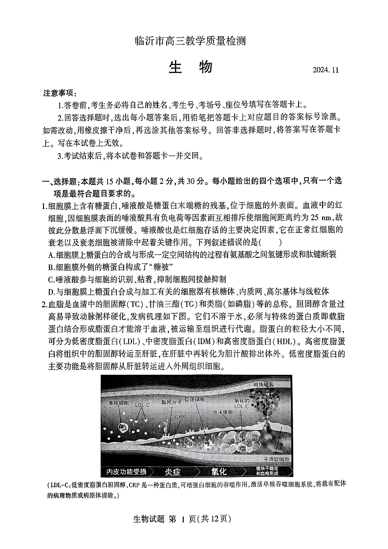 临沂市2025届高三上学期教学质量检测考 生物