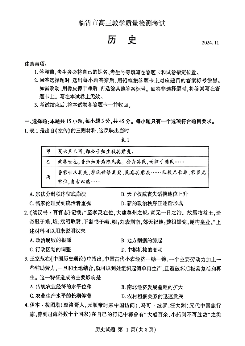临沂市2025届高三上学期教学质量检测考 历史