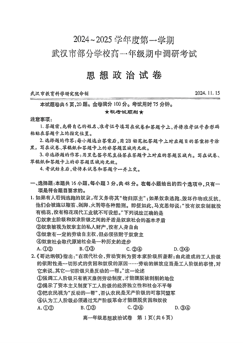 武汉市部分学校2024-2025学年度高一年级期中调研考试 政治