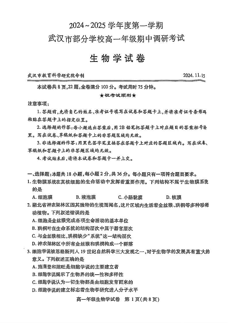 武汉市部分学校2024-2025学年度高一年级期中调研考试 生物