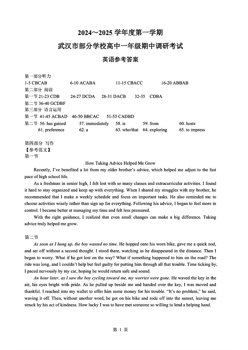 武汉市部分学校2024-2025学年度高一年级期中调研考试 英语答案