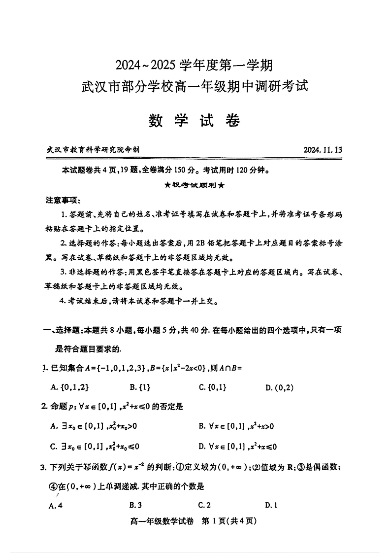 武汉市部分学校2024-2025学年度高一年级期中调研考试 数学