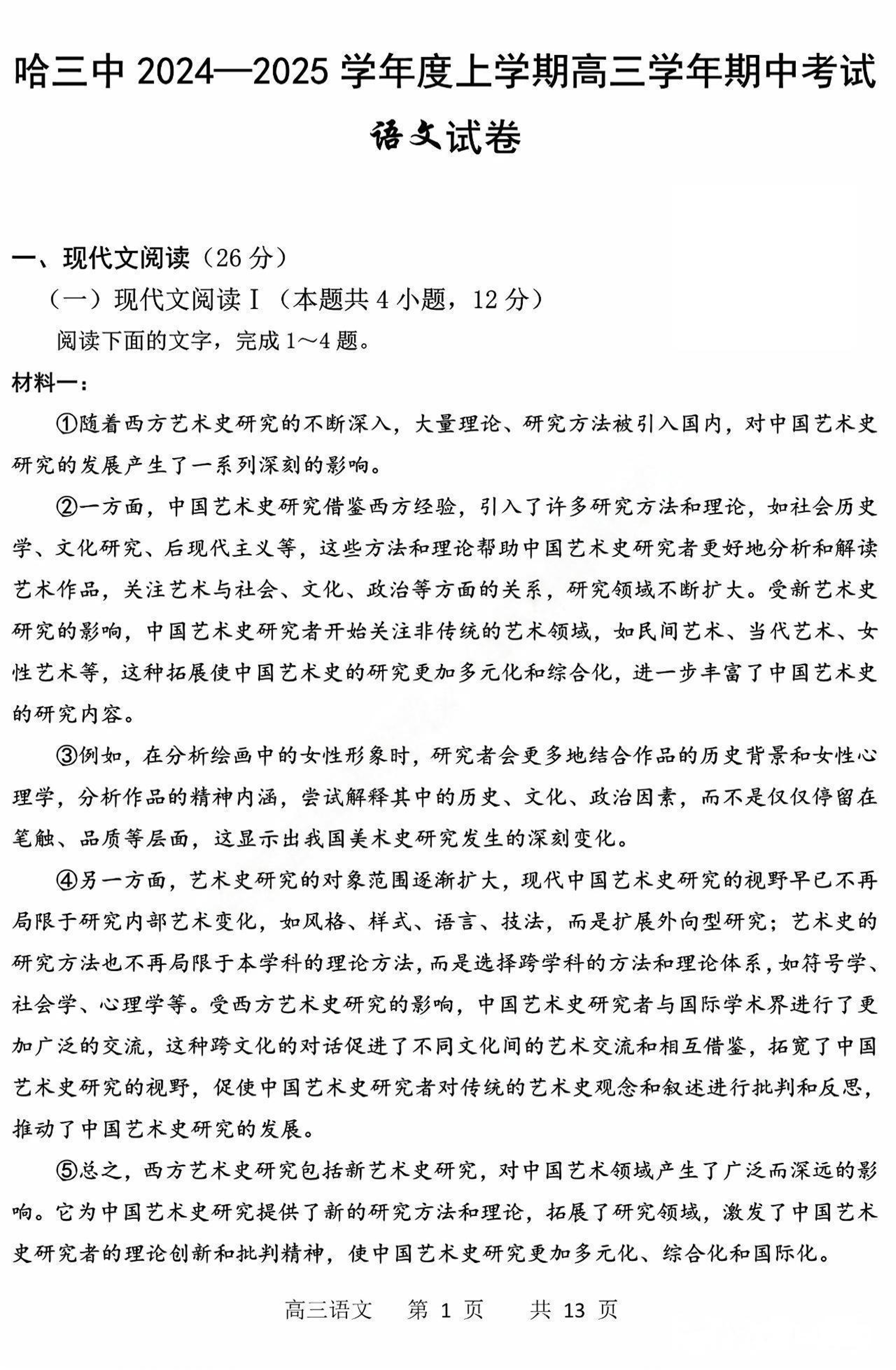 黑龙江省哈尔滨市第三中学2025届高三上学期期中考试 语文
