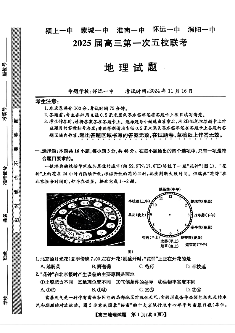 安徽省2025届高三第一次皖北五校联考 地理无答案