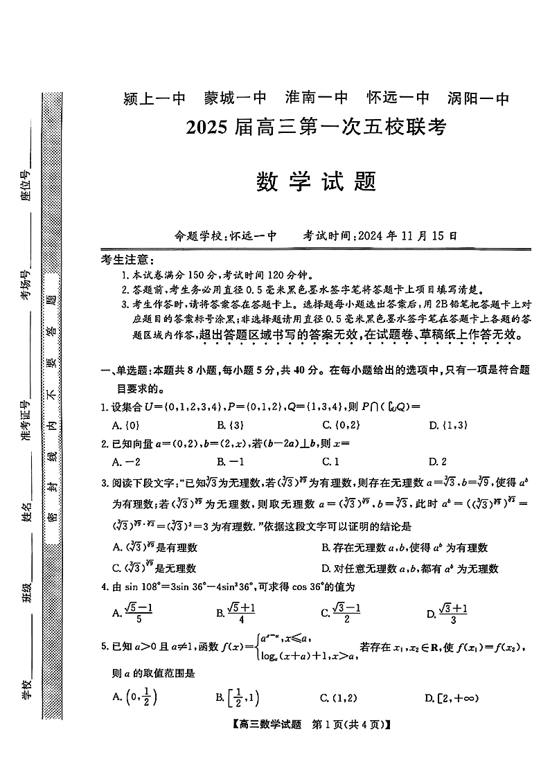 安徽省2025届高三第一次皖北五校联考 数学