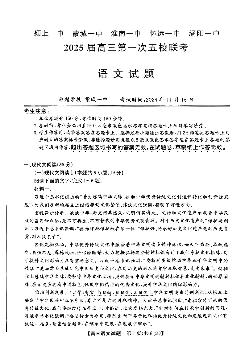 安徽省2025届高三第一次皖北五校联考 语文