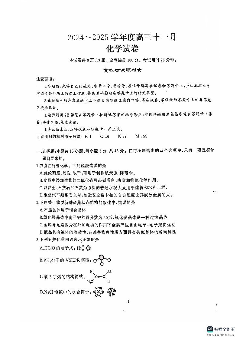 湖北省武汉市江岸区2024-2025学年高三上学期11月调考 化学